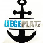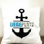 Auf der Oberseite der Kissenhülle ist das Wort Liegeplatz und ein Anker (zweifarbig) aufgedruckt.