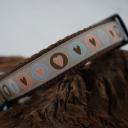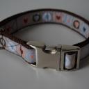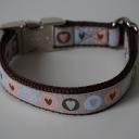 Das Halsband besteht aus braunem Gurtband mit einer Herzchenborte in grau.