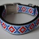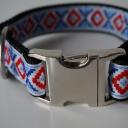 Das Halsband Rauten Rot/Blau besteht aus schwarzem Gurtband.